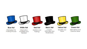 Edward de Bono’s Six Thinking Hats are a tried and tested way of keeping discussions on track, reducing overall meeting times, improving the quality and tenor of debate, resulting in decisions that everyone in a meeting can feel they played a part in reaching. Google “six thinking hats” and you will find lots of descriptions of the hats and what they are used for. Incidentally, de Bono chose hats quite deliberately: we already “put on our thinking caps”, and “wear different hats” in different situations, so the concept already exists in popular language. It is also worth noting that the Hats are not a personality measure – the idea is that everyone uses all the Hats, even if they have a preference to contribute under one over others.